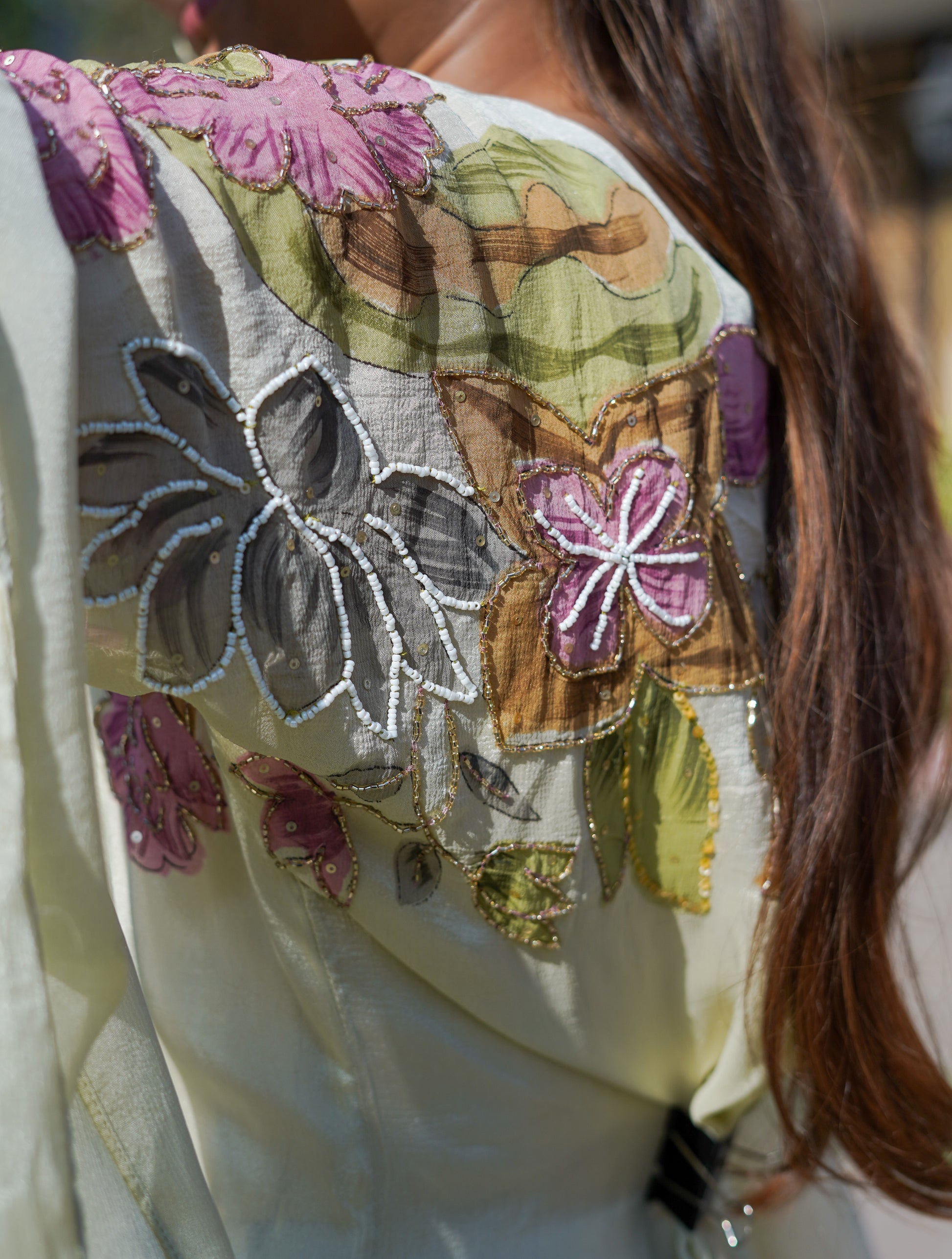 The highlight lies in the printed neckline and back detailing, delicately outlined with subtle bead work that adds a refined shimmer without overpowering the look.