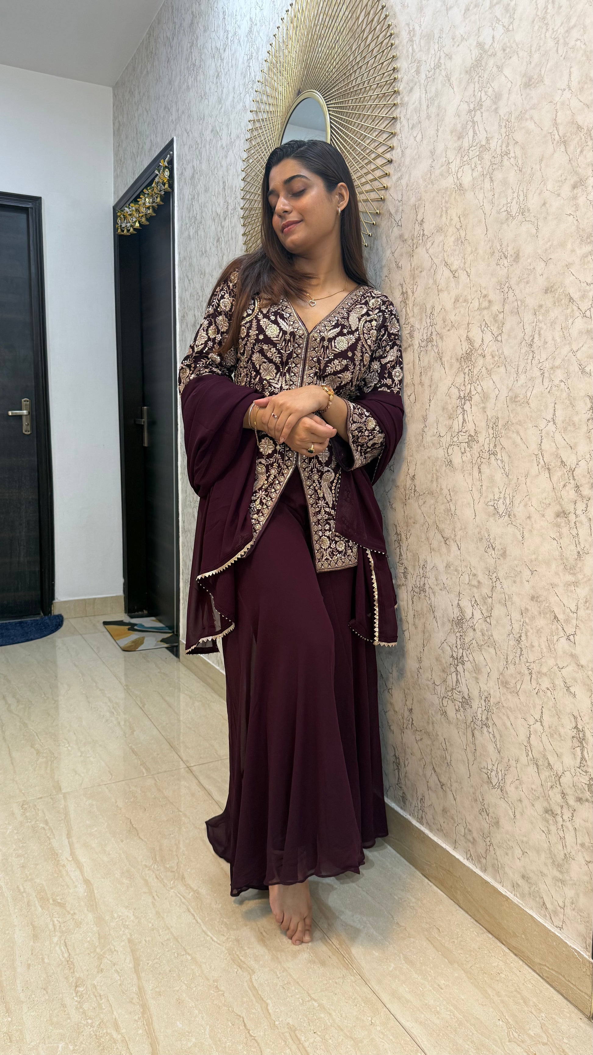 Radiating understated elegance, the Sunehri Phool co-ord Set is crafted in a rich mustard hue with delicate floral embroidery adorning the yoke, sleeves, and collar. The straight kurta is paired with a flowy palazzo featuring subtle all-over booti work, adding texture and charm to the ensemble.
